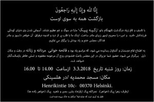 به مناسبت در گذشت خواهر خانم اقای نصراالله پیک عضو شورای اجرایی وعضوهیات موسسان کانون مجلس فاتحه در روز شنبه تاریخ 03.03.18 از ساعت 14:00الی 16:00 در مسجد محمدیه هلسینکی برگزار میگردد. هیات رهبری کانون به اقای نصرالله پیک و خانواده محترم شان این ضایعه را تسلیت می گوید.