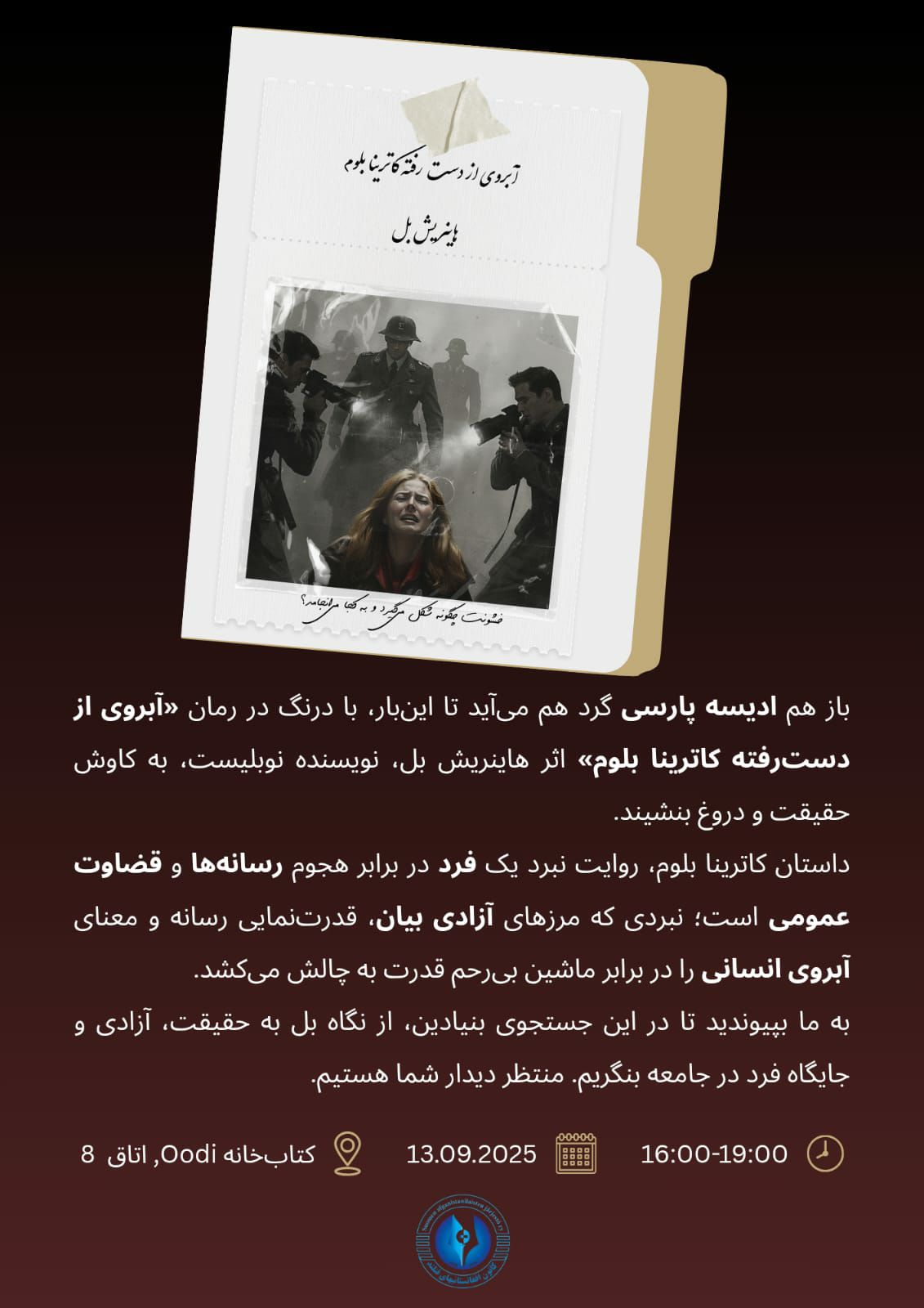 در این نشست، رمان «آبروی از دسترفته کاترینا بلوم» اثر هاینریش بل، نویسنده نامدار و برنده جایزه نوبل ادبیات، مورد بررسی و گفتوگو قرار خواهد گرفت.