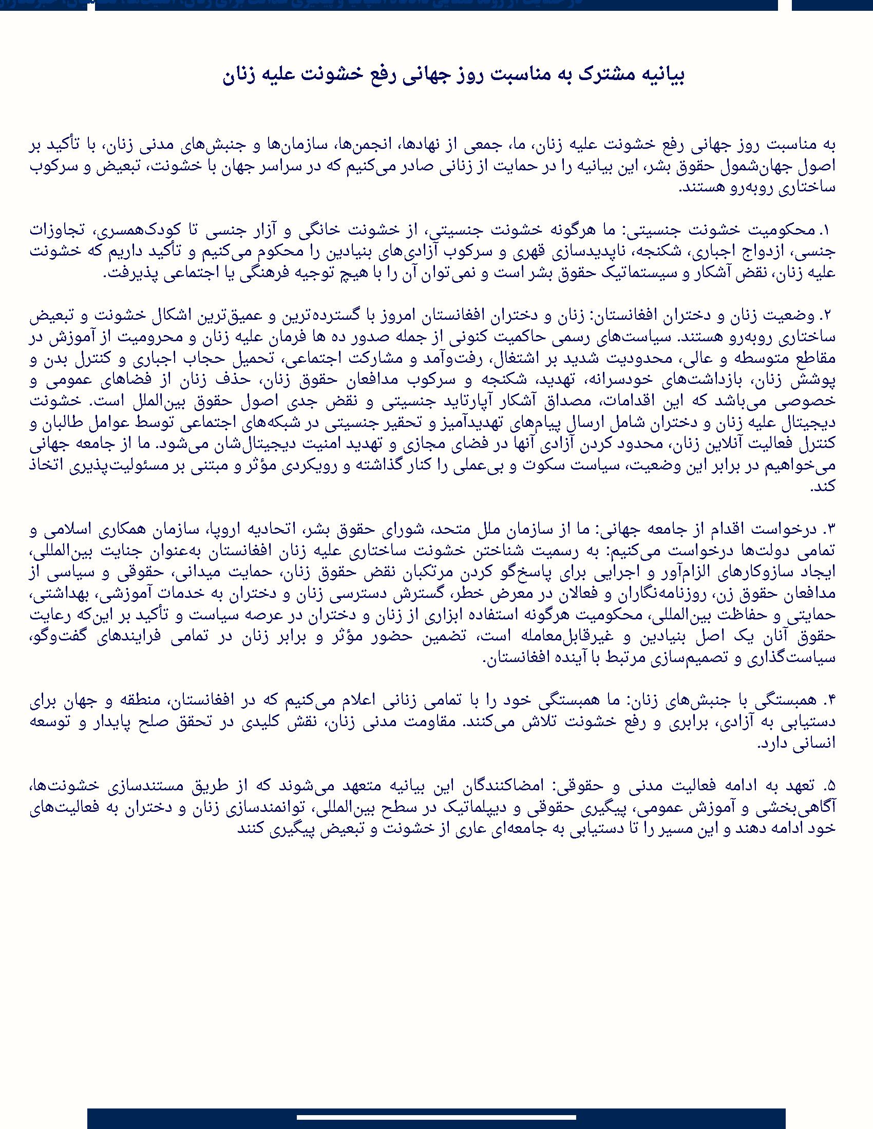 این بیانیه، به مناسبت روز جهانی رفع خشونت علیه زنان و از سوی مجموعهای از نهادها و جنبشهای مدنی منتشر شده و بر حمایت از زنانی که با خشونت و تبعیض روبهرو هستند تأکید میکند. بیانیه هرگونه خشونت جنسیتی از جمله آزار، کودکهمسری، ازدواج اجباری و سرکوب آزادیها را محکوم کرده و وضعیت زنان و دختران افغانستان را نمونهی بارز خشونت و تبعیض ساختاری میداند؛ از جمله محرومیت از آموزش و اشتغال، محدودیتهای شدید اجتماعی، بازداشتهای خودسرانه و خشونت دیجیتال، و آن را مصداق آپارتاید جنسیتی میخواند.