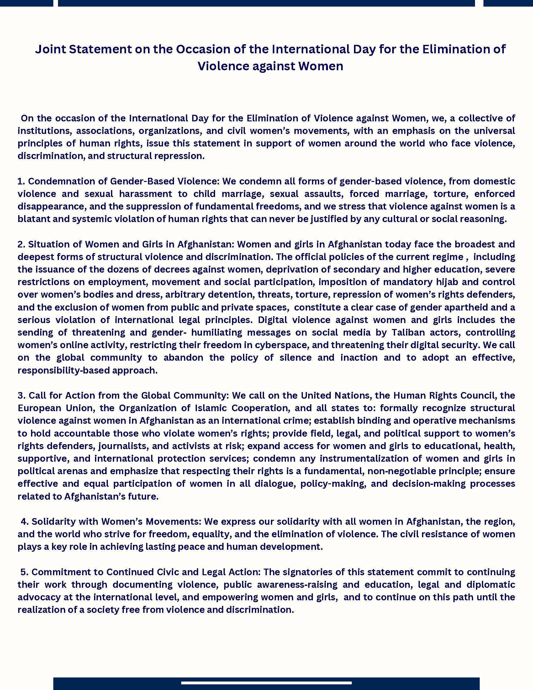 3. Call for Action from the Global Community: We call on the United Nations, the Human Rights Council, the European Union, the Organization of Islamic Cooperation, and all states to: formally recognize structural violence against women in Afghanistan as an international crime; establish binding and operative mechanisms to hold accountable those who violate women’s rights; provide field, legal, and political support to women’s rights defenders, journalists, and activists at risk; expand access for women and girls to educational, health, supportive, and international protection services; condemn any instrumentalization of women and girls in political arenas and emphasize that respecting their rights is a fundamental, non‑negotiable principle; ensure effective and equal participation of women in all dialogue, policy-making, and decision‑making processes related to Afghanistan’s future.