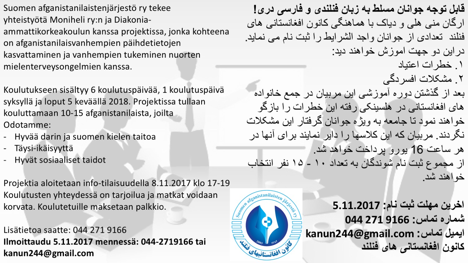 ارگان منی هلی و دیاک با هماهنگی کانون افغانستانی های فنلند تعدادی از جوانان واجد الشرایط را ثبت نام می نماید.